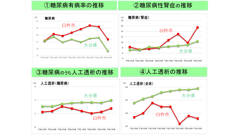 平成22年度から大分県中部保健所、当市、臼杵市医師会、臼杵市医師会立病院コスモス病院(中核病院)、協会けんぽ大分県支部などが連携し、「臼杵市糖尿病等生活習慣病対策ネットワーク」を構築している。この取組みは、市民に対して講演会などを通じて糖尿病についての普及啓発を図ることに加えて、保健指導の中でHbA1cの指標を捉えて、早期に専門医につなげて早期診断とその後の介入を行っていくことで透析などの重症化を防ぐことを目的としている。
