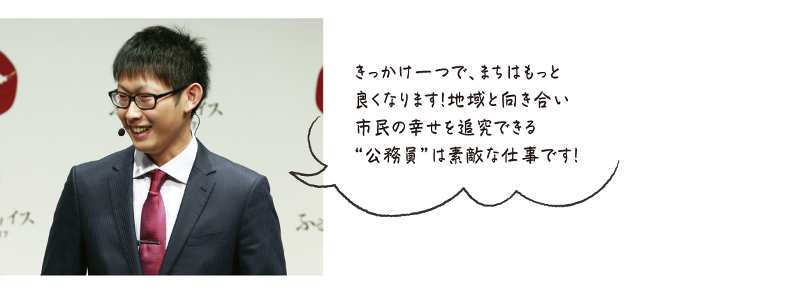こだま ゆうたろう:2013年、坂井市に入庁。財務部課税課で国民健康保険税、個人住民税などの業務を担当。2016年には、総合政策部企画情報課で「寄附市民参画制度」にもとづく「ふるさと納税返礼品」の立ち上げに尽力。同時に移住推進、坂井市専属住みます芸人事業、シビックプライドの醸成事業に携わる。2020年、国内最大級のふるさと納税大賞「ふるさとチョイスアワード2020」において「チョイス自治体職員大賞」を受賞。現在も、ふるさと納税のほか、人口減少対策、まちづくり、地域活性化などに取り組んでいる。