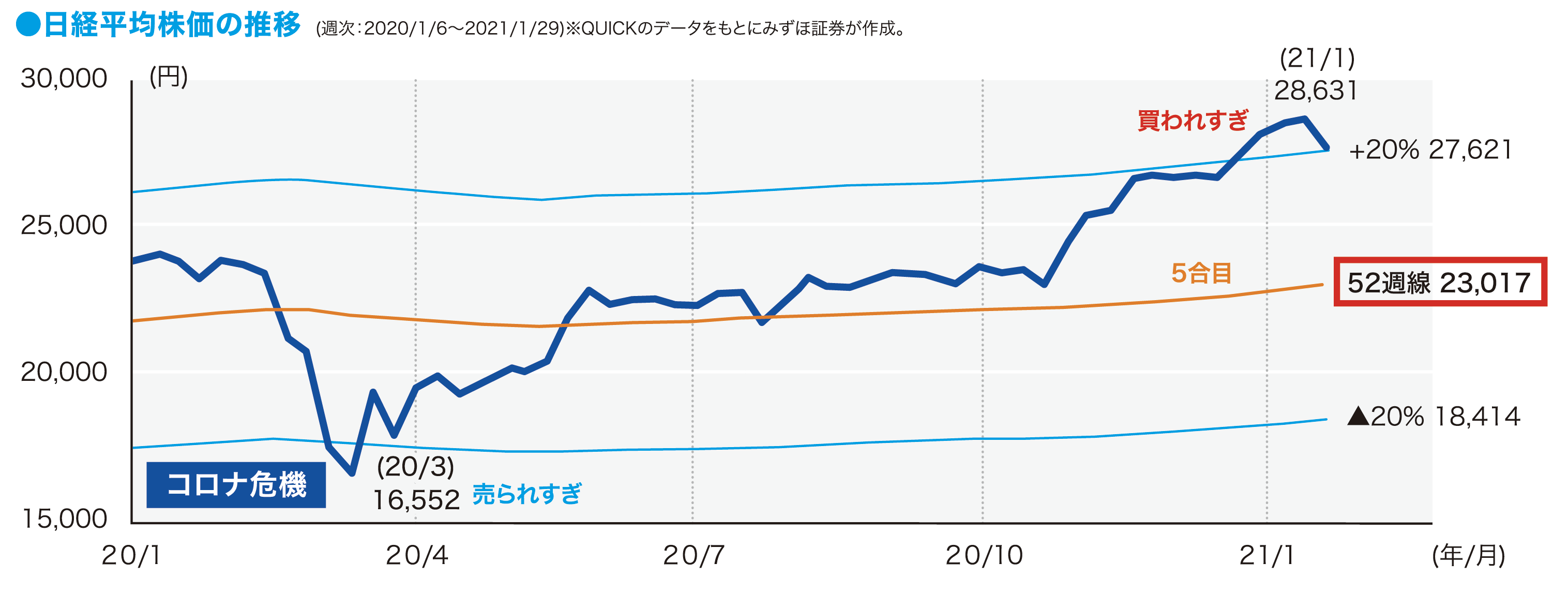 相場の平均値である“5合目”はご存知ですか。まずは、そのモノサシとなる「長期チャート」の見方を知っておきましょう。そもそもチャートとは、過去の株価の値動きをグラフ化したもの。上がるか下がるか、株価の“天井”や“底”を判断する際に使います。チャートを確認する際に注目すべきなのは、「52週線」。直近1年間における株価の平均値の線のことです。この52週線の上下それぞれ2割くらいの範囲で、日経平均株価は変動する傾向がみられます。例えば、日経平均株価の52週線が2万3,000円台、現在値が2万7,000円台の場合、毎月コツコツ積立をしていれば、1年で2割近くの評価益になります。