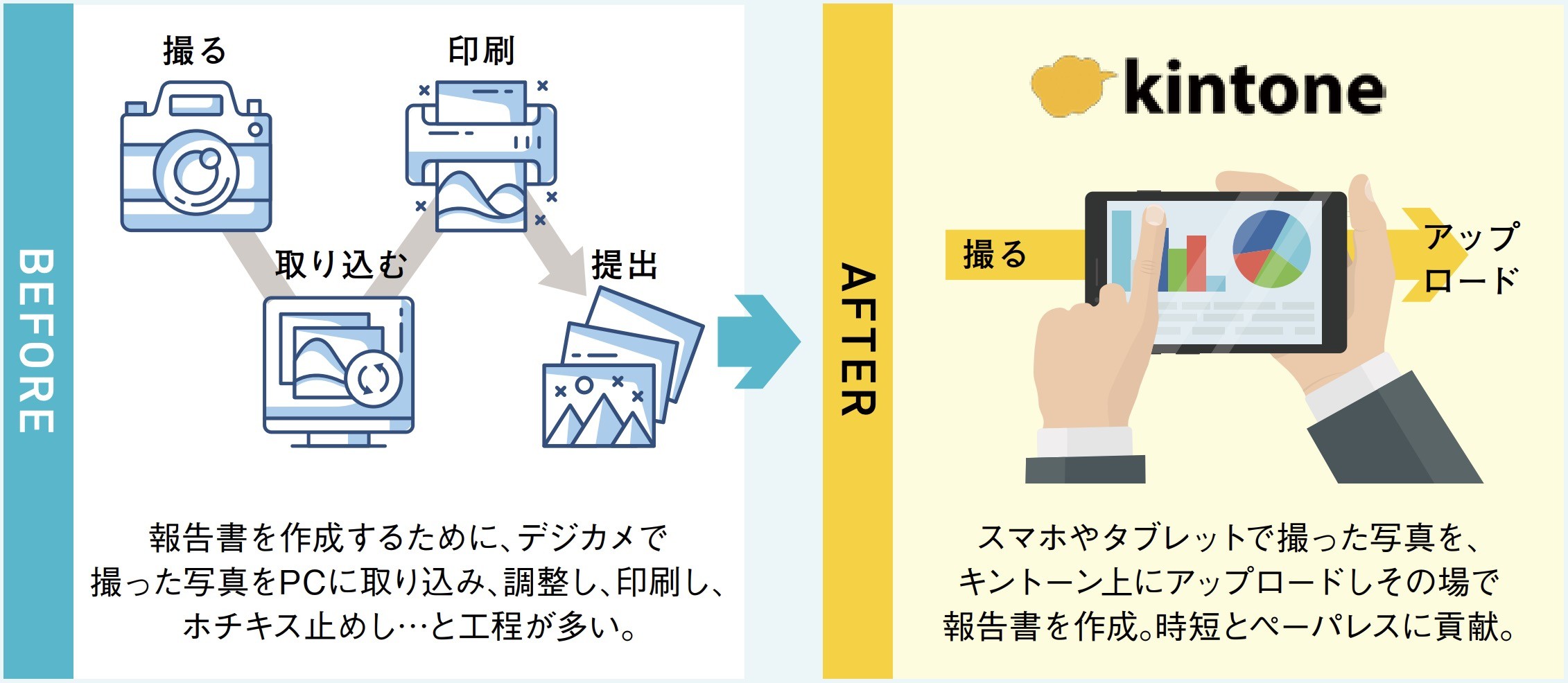 ■写真や報告書の出力・供覧も、キントーン上で行えば簡単&ペーパーレス!
