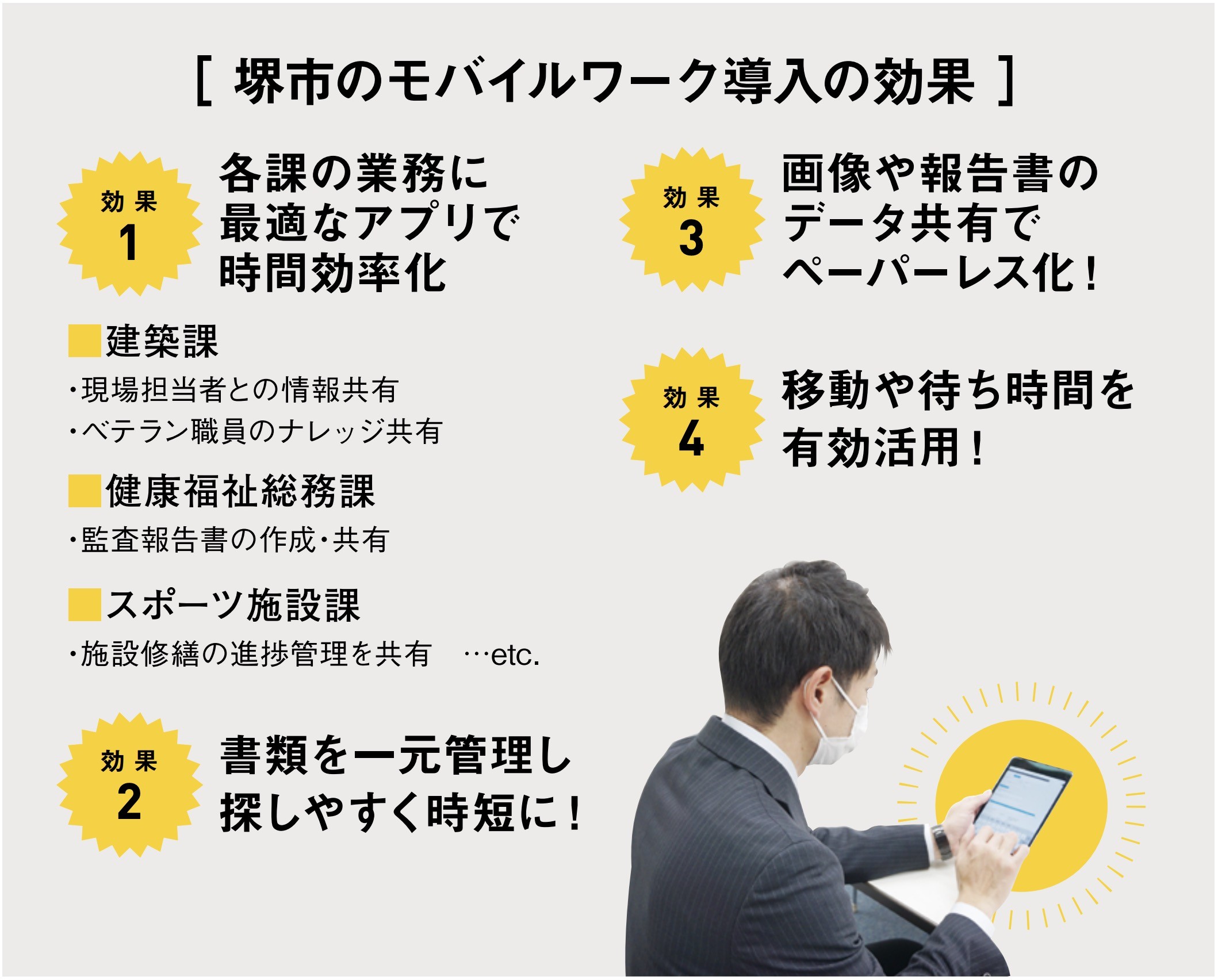 堺市では、働き方改革を推進するに当たり、職員の勤務状況を改善し、職員が本来取り組むべき業務に多くの時間を振り分けられるようにモバイルワークを導入することを決めた。これは、現場からの「帰庁してからメモを報告書にまとめるのが大変」「外出時に携行する資料が多い」といった声を受けてのことだと、同市ICTイノベーション推進室の阪井さんは語る。「改善すべき点が多いのは明白でした。そこで、平成30年に具体的な課題を洗い出すためのワークショップを開催しました」。