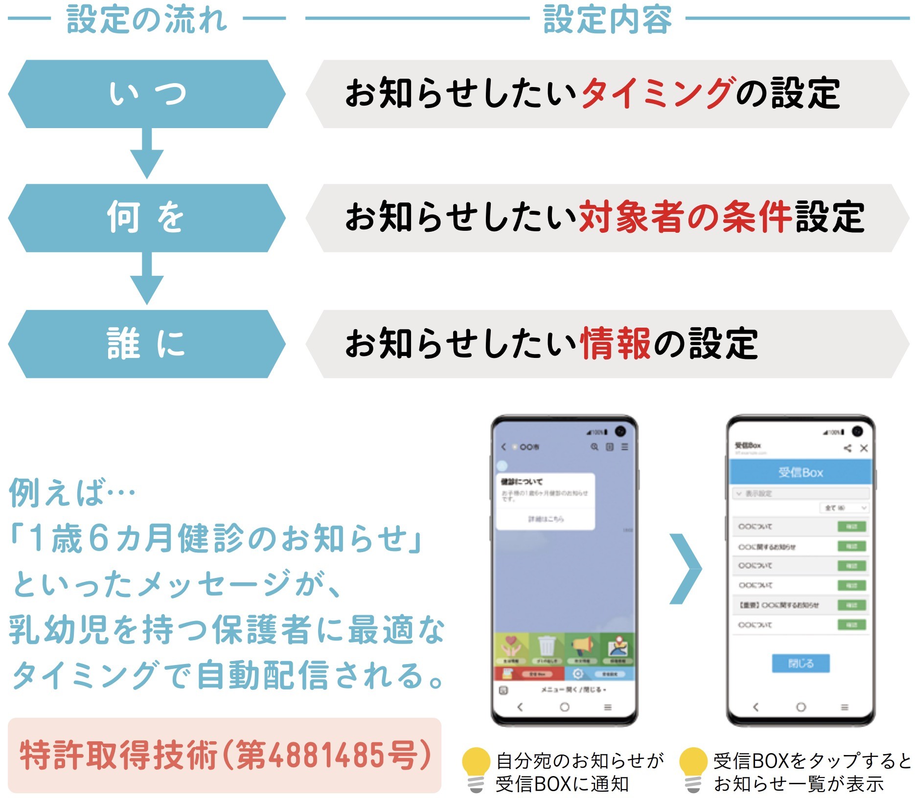スマートシティコンシェルは、LINEを媒体とし、サイボウズ社製の業務アプリ構築クラウドサービス「kintone(キントーン)」をデータベースに開発された、情報発信プラットフォーム。福岡市LINE公式アカウントと同様に、住民に生活や防災などの情報を配信できることに加え、「当社では、お届けしたい情報をタイムリーに通知できる特許取得技術を保有しており、民間開発実績は25年間で250業種。その技術を基盤にした強みを持っています」と福島さん。主な特長として以下の4点を挙げる。①特許技術を活かした情報通知:住民の“属性情報”や“アンケート回答情報”を用いて事前に設定した条件に該当するユーザーのみに自動配信する機能。(例えば、子どもを持つ親へ乳幼児健診が近いことを知らせるなど)②セグメント配信:複数のアンケートデータを住民ごとに一元管理しているため、それらを組み合わせたセグメント配信を行うことが可能。③kintoneベースのシステム:複数の自治体で採用され、高い評価を受けているkintoneをベースに開発されているので、汎用性が高く柔軟な運用に対応可能。④高いセキュリティ:基盤となるLINE、kintoneともに高度なセキュリティ性を持ち、さらにLGWANの環境下での運用も可能(一部機能の制限あり)。