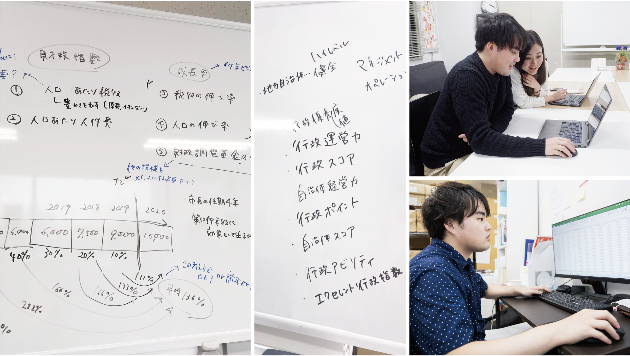 「最初に見るべきものは、“人口”と“税収”だろうという話になりました。しかし、これだけでは全ての自治体を平等に比較することはできません。公平に比較するにはどうしたらいいのかを考え、独学でインターネットで調べたり、総務省に問い合わせたりし、信ぴょう性の高いデータを集めました。現在の5項目に決めるまでに5カ月ほどかかりました」と中田さん。指標には増減率を含んでいる点も大きな特徴で、「人口数や税収額だけを指標にすると、地方の小規模自治体は都市部に比べて劣っているかのように見えてしまいます。しかし、増減率であらわせば、額が小さくてもプラス2倍になったなど、その頑張りが見えるようになります」と原口さん。