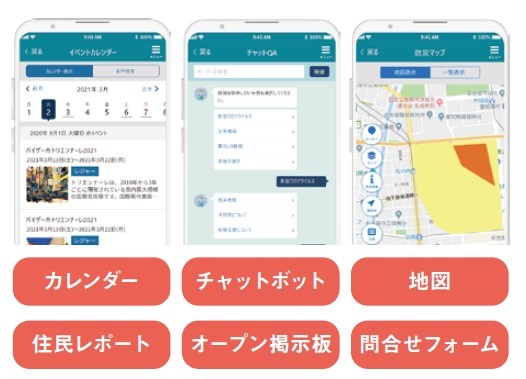 防災向け機能(プッシュ通知や最大音量通知など)を装備したコンテンツや、生活支援系のコンテンツ(カレンダー・住民レポートなど)の制作・更新・管理が可能。オフライン機能では、通信が遮断されてもハザードマップなどの閲覧ができる。