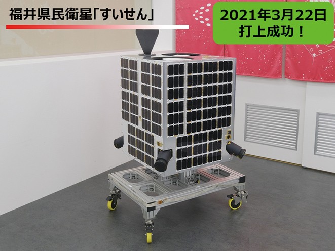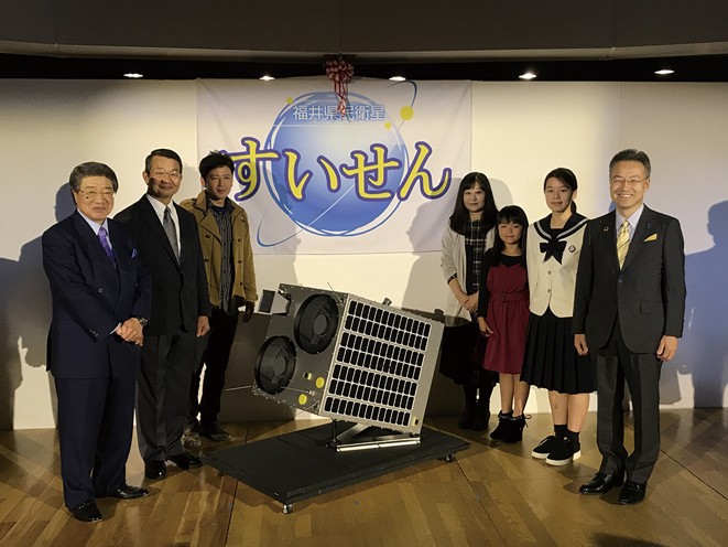 これと並行して進んだのが、県民衛星「すいせん」のプロジェクトだ。前述の研究会とは別に、同県と県内外の企業で組織される「福井県民衛星技術研究組合」を設立。平成28年度から、宇宙ベンチャー企業のアクセルスペース社とともに、望遠カメラを搭載した約60×60×80cmの人工衛星製造をスタートする。同時に衛星画像利用システムの開発も進め、無事打ち上げに至った。「県民衛星の名前を一般公募した際、1,300超の応募があり、県民の関心の高さを感じました。メディア各社などからも注目していただき、よい船出になりました」。