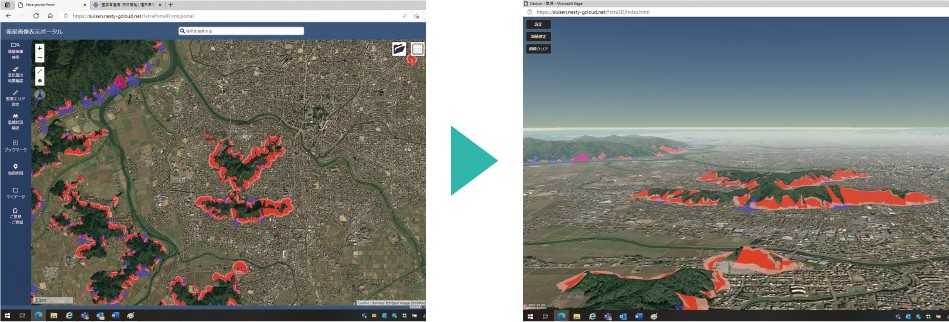 衛星画像に県のオープンデータを重ねることで、地すべり
