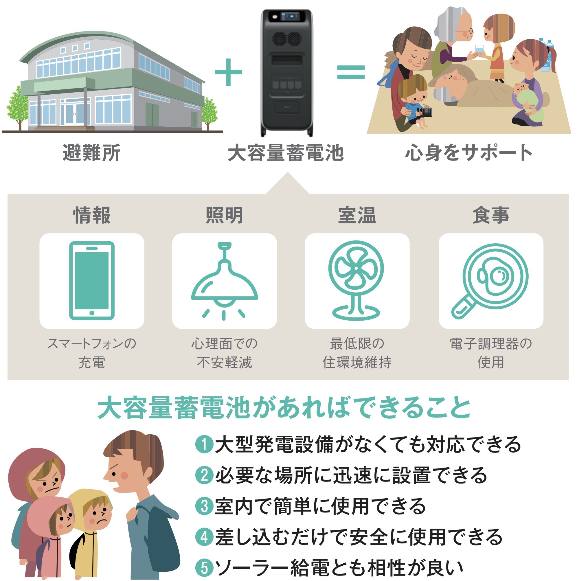 そこで、私たちが設置を呼びかけているのが、大容量蓄電池と太陽光発電ソーラーパネルなのです。充電しておけば、サッと設置し、直感的な操作ですぐに利用することができます。また、長期化にも対応可能です。