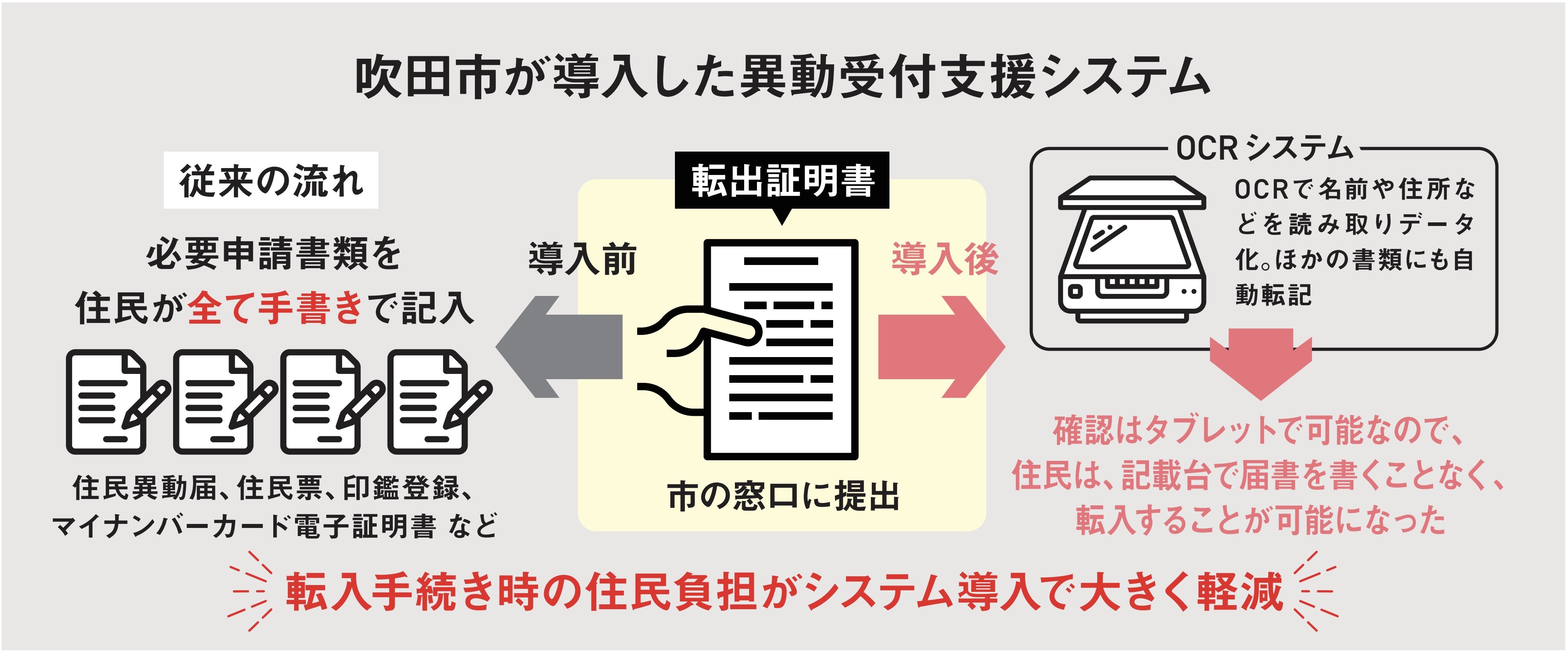 転入者は、直前に住んでいた自治体から発行される転出証明書を窓口に提出。窓口の担当者は、その証明書をOCRで読み取りデータ化し、住民異動届に反映。その後、転入者本人に、内容をタブレットで確認してもらうことで手続きが完了する。なお、データはそのほかの必要書類にも自動転記されるので、一連の転入手続きにおいて、手書き作業の手間が大幅に軽減される。
