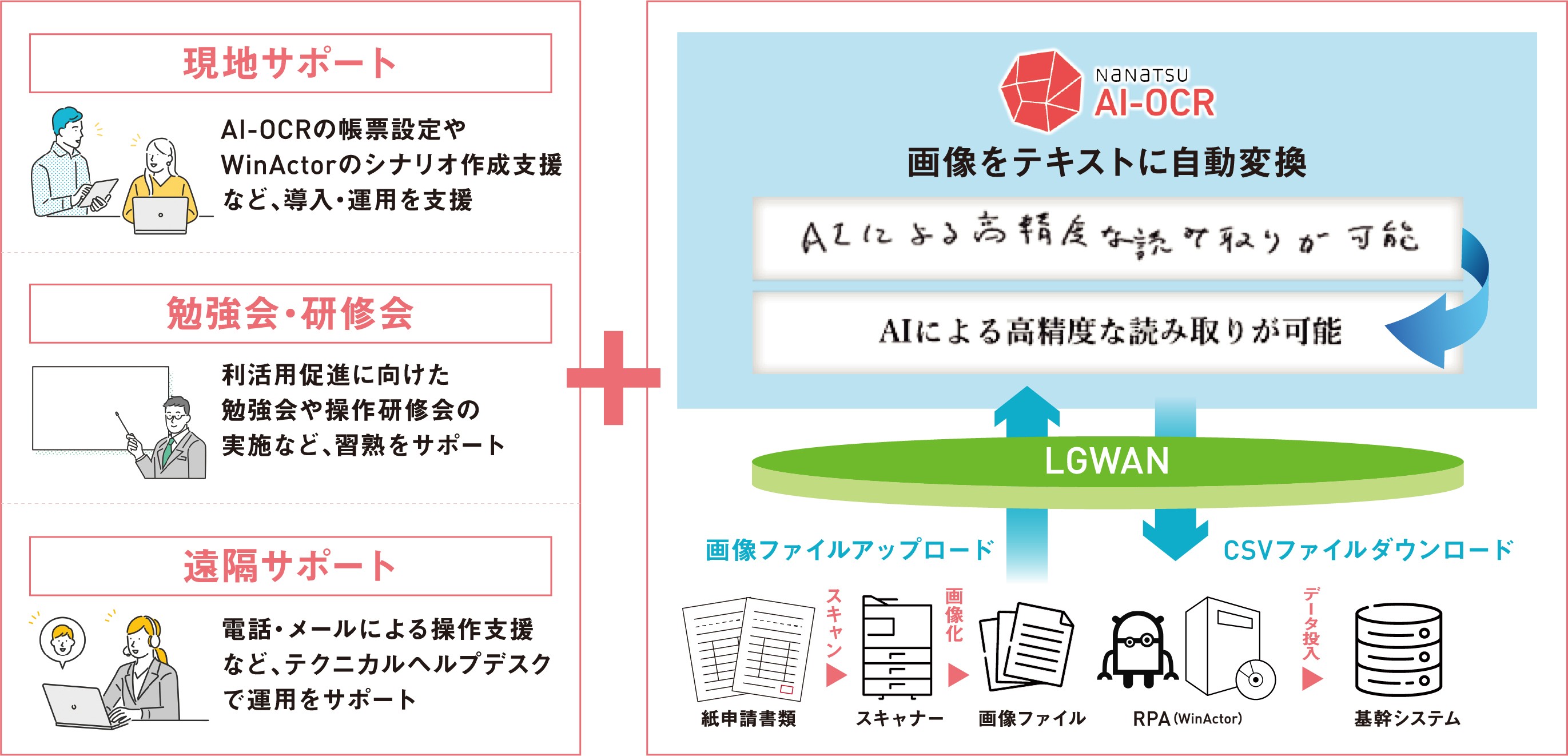 その点、当社が提案する「NaNaTsu AI-OCR with DX Suite」は、専門的なスキルを要する事前準備も、多額のシステム構築費用も不要で、契約後すぐに使い始めることが可能です。また、システムはすべてLGWAN上に構築されており、職員の皆さんもLGWAN経由でサービス利用する形態なので、インターネットとの接続は一切発生せず、セキュアな環境のもと、安心して業務効率化に取り組んでいただけます。