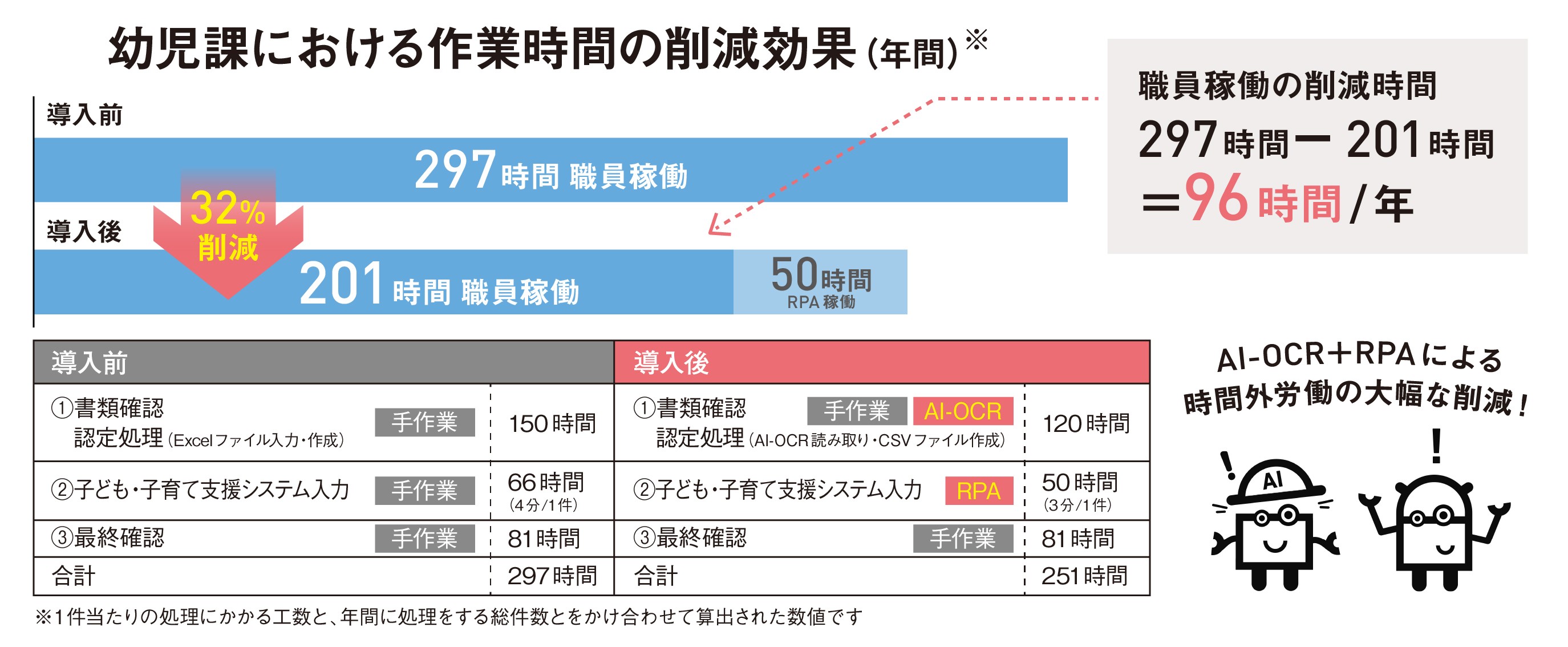同課の場合、認定申請書や入園申込書、各種証明書などの受付後、認定処理を行い、その結果を1件ずつ手入力する。この作業を年間1,000件ほどこなしているという。そのため、自動化による効果の見込みは大きい(下記一覧参照)。「作業時間を削減できているのを知り、まわりの課の職員からも『他の作業にもRPAを使えないだろうか』といった前向きな意見が出始めています」と三浦さん。「当初、RPAのシナリオを職員が作成することも想定していました。しかし、デジタルに苦手意識を持つ者も多く、庁内業務を一気に自動化するのが困難でした。今後は研修会などを実施し、全職員の意識改革とともにDXに向けて推進していきたいです」と意欲的だ。