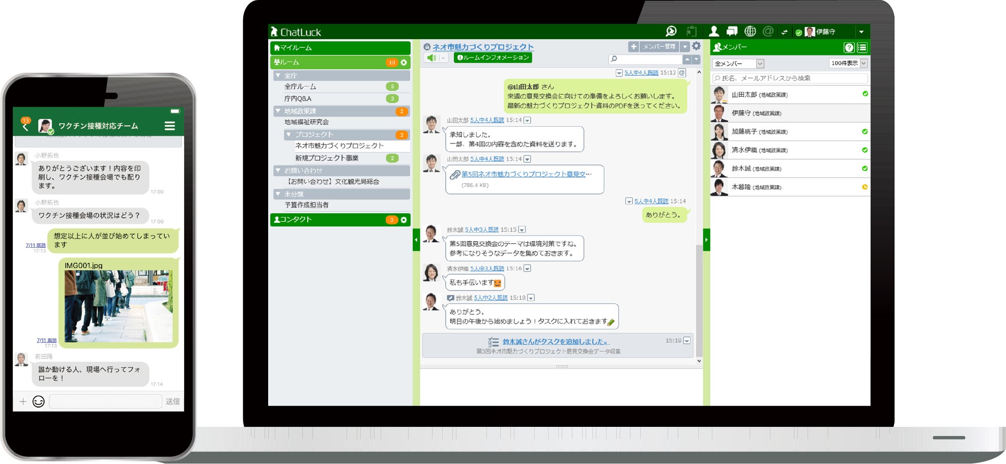 庁内のコミュニケーションが非効率だと、おのずと外部との情報共有も遅れがちになる。特に、新型コロナワクチンの集団接種事業が始まった現在、医療機関などとのやり取りにおいては、正確で迅速な対応が求められている。「ChatLuckには、庁外関係者を“ゲストユーザー”として招待し、ルーム内で職員と同じように利用できる機能があります。総務省のガイドラインにのっとり、外部とは無害化された情報だけのやり取りに制限することができ、外部ユーザーの利用端末を限定して情報流出を防ぐこともできます」と市村さん。