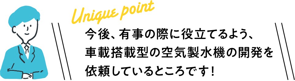 「ありがたいが、飲んだ後は全てプラスチックゴミになってしまう。有事の時に、マイコップやマイボトルで水を飲むことができたら……」との思いから、令和3年3月に試験導入したのが、“空気から水をつくり出す”という空気製水機。水道法が定める51項目の水質基準をクリアする水質で、電気さえあれば常時飲料水を得られるという。現在は、市民が自由に飲用できるようにと、同市の庁舎1階にその製水機を設置。最先端技術を活用しながら、防災の意識を高めている。