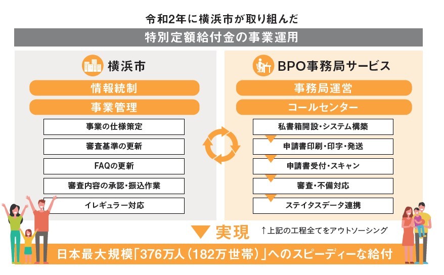 コロナ禍への経済対策として施行された特別定額給付金事業。横浜市はこれに伴う一連の業務を、日本郵政グループ「JPメディアダイレクト(以下、JPMD)」の「BPO事務局サービス」を活用して運用。申請のピーク時は1日平均5万件の処理速度で給付を行った。