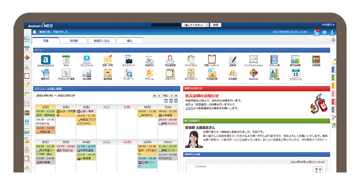 当社は20年以上前からグループウェアの開発・提供を手がけており、その最新製品が「desknet's NEO」です。スケジュール管理はもちろん、申請業務の効率化やペーパーレス化を図る「ワークフロー」、「設備予約」、「ウェブメール」など、業種・業態を問わず業務効率化に役立つ機能を搭載しており、令和3年7月末時点で約450万人の累計導入実績があります。ICT機器の操作に不慣れな方でも使いこなしやすいシンプルなレイアウト、全職員が一斉にログインする時間帯でも応答性能が落ちないシステムの安定性に、利用者の皆さまからご好評いただいています。