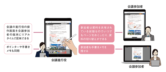 庁内会議や議会など、紙資料を利用することの多い会議体をペーパーレス化し、会議運営のコストを削減する「SmartViewer(スマートビューアー)」を標準搭載。各種ウェブ会議ツールと組み合わせ可能で、効率的なペーパーレス会議を実現。