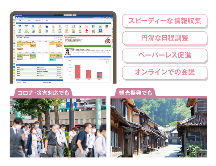 それら一連の業務においては、当然ながら会議や打ち合わせなどが必要になるが、同市観光振興課では感染対策として対面での会議を減らすためにデスクネッツ ネオをうまく活用。「回覧・レポート」「インフォメーション」「ネオツイ」などの機能を用いて、意見の集約と情報共有を図った。グループウェア活用で人的な接触が減らせたのはもちろん、以前と比較して業務効率化も実感できたという。