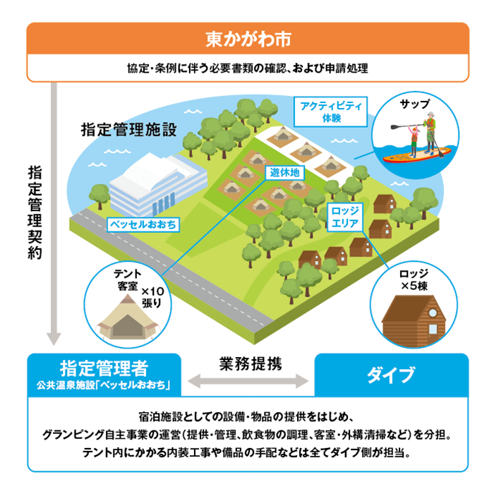 グランピング事業にかかる設備投資や運営ノウハウ、人材の投入は全てダイブが負担すること、そして、指定管理者の業務を“横取り”ということではなく、現状のまま新たな利益を生み出すことが、当社が提案する“公共の指定管理施設×グランピング自主事業”の最大の特徴です。