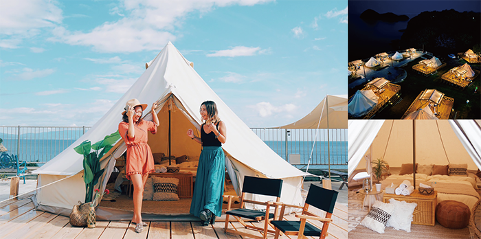 グラマラス(魅惑的な)とキャンピングを組み合わせた造語。多くはホテルのように整った設備と食事、サービスが付帯しており、地域ならではの環境を活かした体験を楽しめる施設もある。
