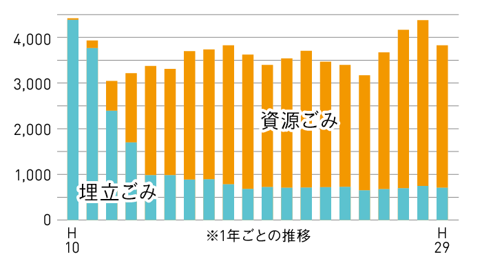 平成10年に4,382トンだった埋立ごみが平成29年には708トンまで減少。約84%の削減に成功し、1人当たりごみ処理事業経費は全国平均を大幅に下まわっている。
