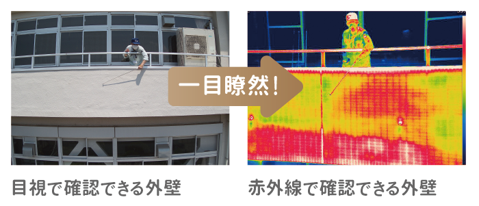 外壁に欠陥(浮きなどの変状部)がある場合、健全部と比較し表面温度が高く、赤く表示される。そのため、外見では分かりづらい劣化状況を把握することが可能。