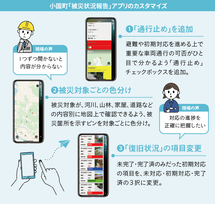 同アプリは、現在もカスタマイズを続けている。現場からの意見を反映し、赤色で表示される「通行止め」の項目を追加したり、被災対象ごとに地図上のピンを色分けしたりなどのアップデートを実施。これらの作業により、迅速・確実な被災情報の共有はもちろん、住民への避難経路指示を出しやすくするなど、着実に進化しているという。