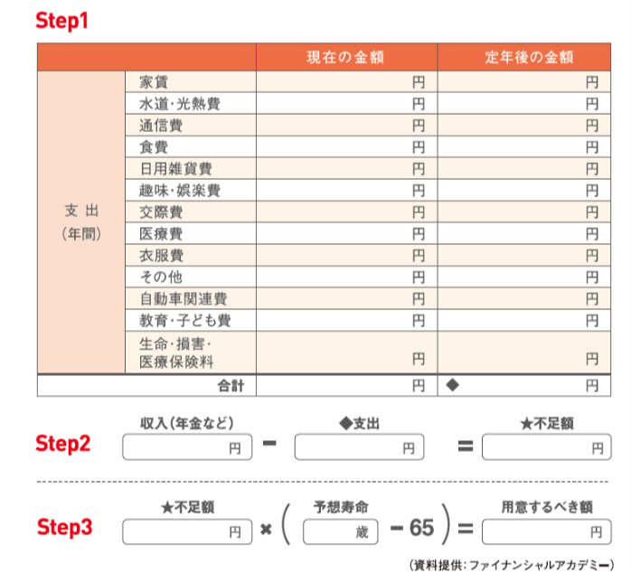 では実際に今の家計から定年後の収支を把握してみよう。下図の表に現在の支出を書き込み、隣には定年後に予想される支出を記入。その数字を収入(定年後の年金など)からひいてみると不足額が見えてくるはずだ。数字が出たら、次は「不足額×(予想寿命−65)」(※65は定年退職時の年齢)を計算。すると自分が老後に大体いくら用意するべきかが導き出される。これこそが、あなたが向き合う現実なのである。