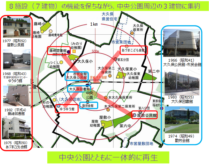 全国的にも老朽化が進んでいる習志野市の公共施設の老朽化対策として、平成26年3月に策定した「公共施設再生計画」のモデル事業として実施。京成大久保駅周辺1km圏内にある4つの施設(屋敷公民館、藤崎図書館、あづまこども会館、生涯学習地区センターゆうゆう館)と、同駅前に立地する3つの同種施設(大久保公民館・市民会館、大久保図書館、勤労会館)の機能を統合し、市民の利便性向上や、施設の老朽化対策、財政負担の軽減、周辺地域の活性化といった観点から、官民連携手法(PFI手法等)を導入し、同駅に隣接する中央公園と一体的に、新たな生涯学習施設を再生整備した。