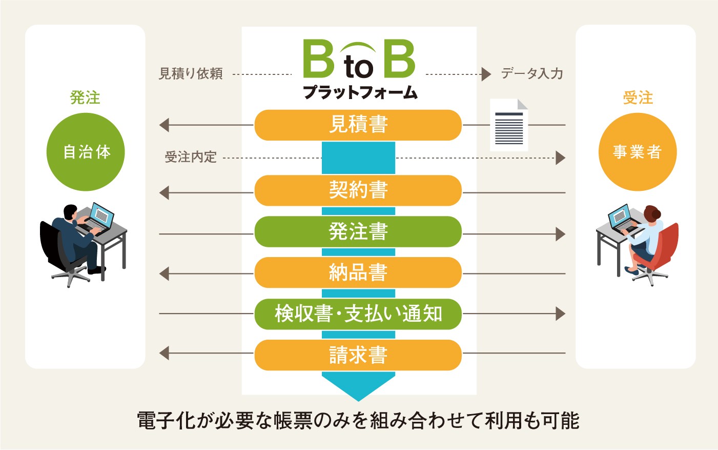 IDを取得すれば、自治体・取引事業者ともに帳票の電子化が実現するBtoBプラットフォーム。電子化が必要な帳票のみを組み合わせられるのも大きな強みだ。