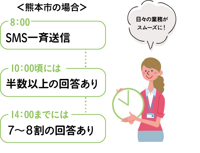 コロナ禍では感染拡大とともに、繁忙状態が突然やってくる。混乱が起きる前に電話・SMSと複数の手段を持ち、事務作業の効率化を図っておく。こうすることで職員の疲弊防止と行政サービスの持続化につながる。