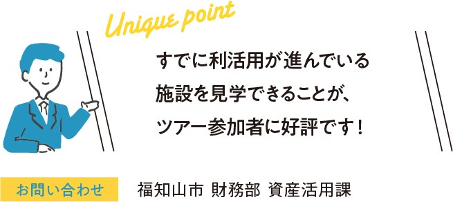 少子化の影響により、全国的に廃校になる学校が増えている。福知山市でも、平成24年度から教育環境の改善を目的とした小学校の統廃合を進めており、9年間で16校の廃校が発生した。同市では、廃校舎を市の資源であると捉え、新たな活用法を模索。利活用に興味のある事業者に対し、「福知山廃校マッチングバスツアー」を令和2年度から開催。バスツアー形式で、事業者と市内の廃校舎を巡り、実際に現地を見学してもらうという催しで、同年には定員の4倍の応募があった。ツアーでは、アンケートにて施設の活用アイデアや、活用に際しての課題をヒアリング。そこで興味を示す事業者とは対話を通して具体的な活用法を探るという。