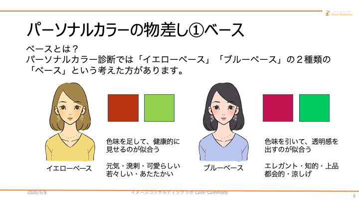 さて、みなさんは「イエベ」「ブルベ」という言葉を知っていますか?知らない人は近くの席の女性に聞いてみましょう。おそらくほとんどの女性がこの言葉を知っていると思います。この「イエベ」「ブルベ」とは、「イエローベース」「ブルーベース」の略のこと。自分に似合う色を調べるために受けるパーソナルカラー診断の基軸となる考え方の一つです。