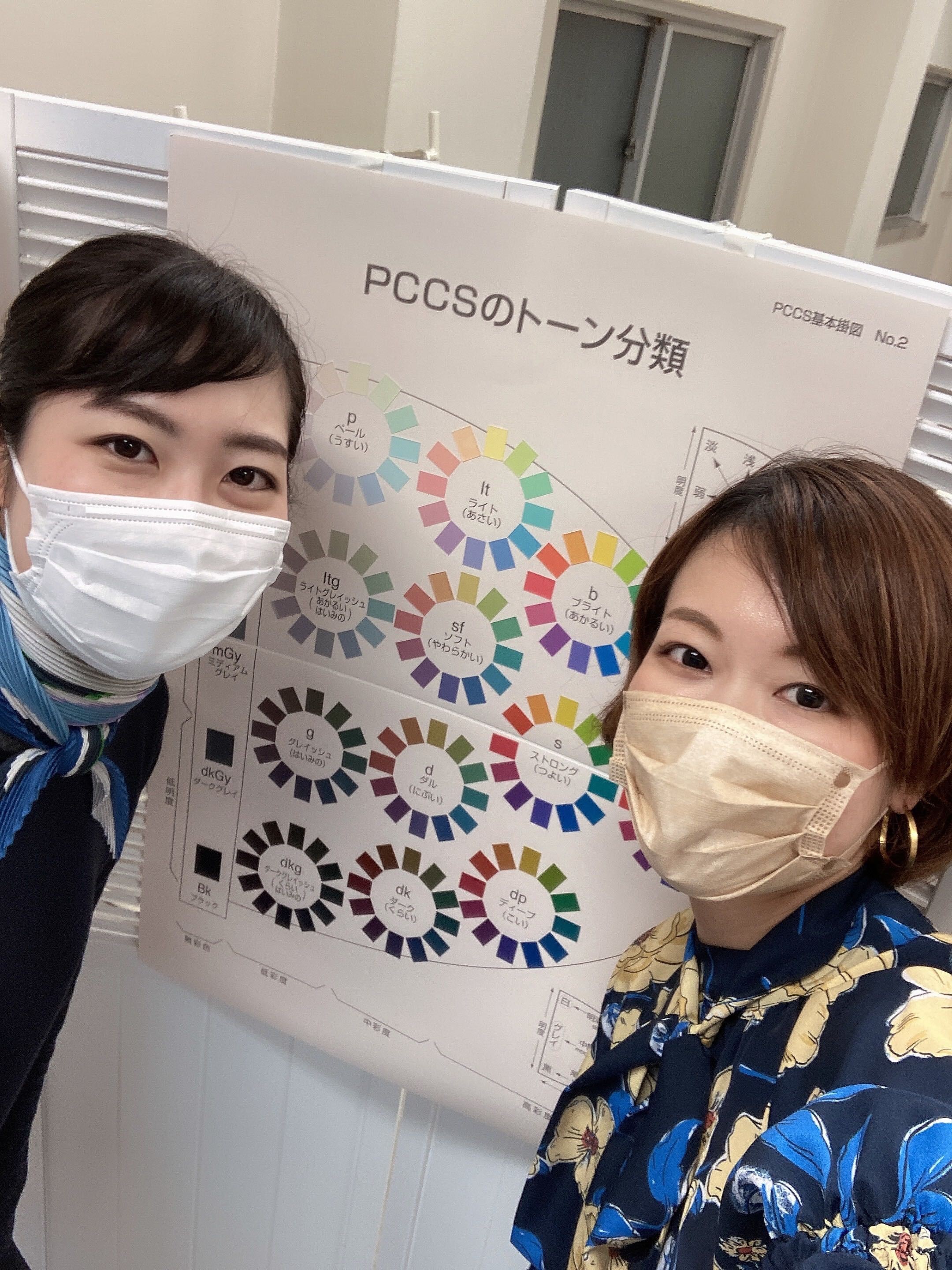 右の私はイエベ、左にいる私のところでイメコン(イメージコンサルタント)を勉強している生徒さんはブルベです。マスクの色も肌と調和していますね〜。
