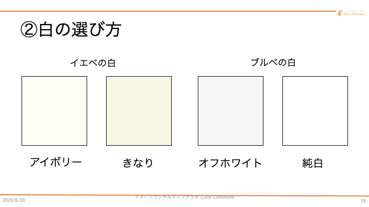 ご覧のとおり「イエベ」の白は黄色の入ったアイボリーやきなり、「ブルベ」の白はオフホワイトや純白です。シャツの色もこの視点で選んでみると、首元の色味と調和して雰囲気がまとまります