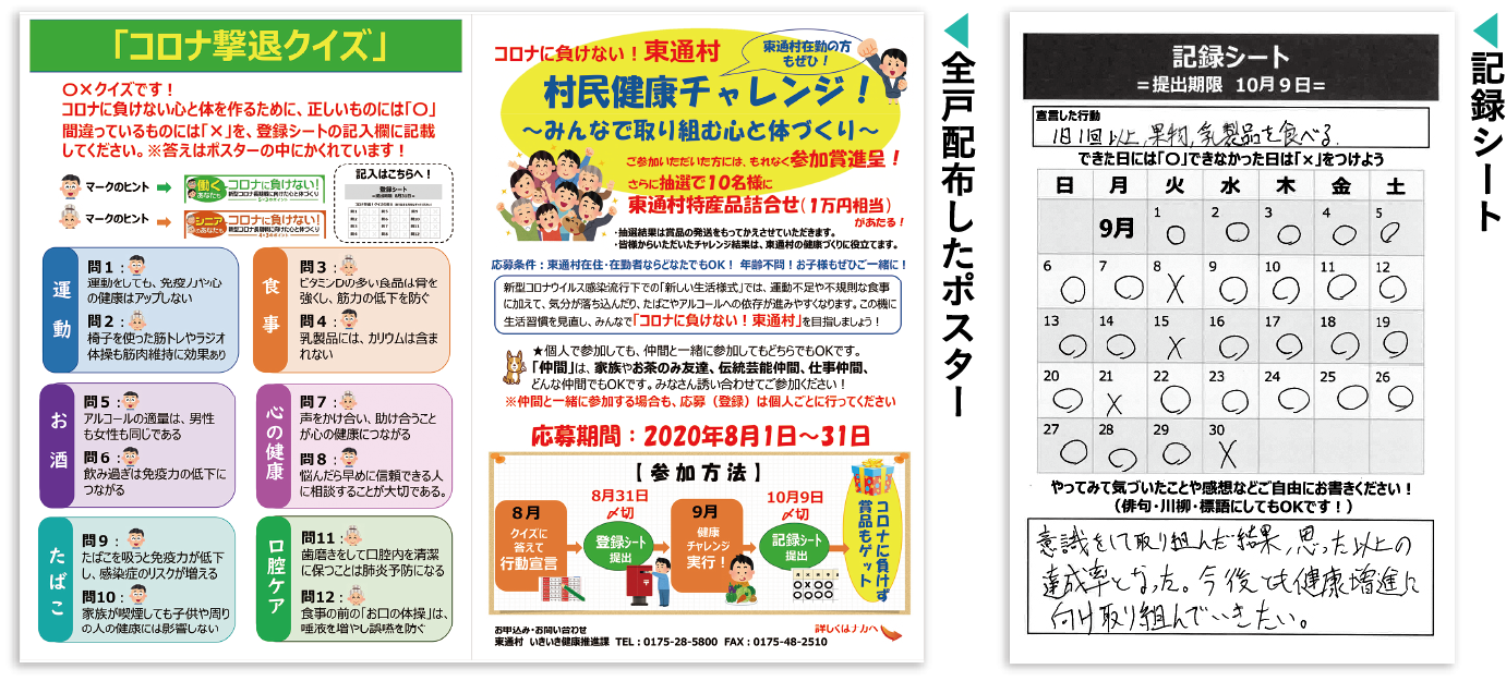 参加には2つのステップがある。ステップ1は、ポスターを参考に、心身の健康づくりに関する「コロナ撃退クイズ」に答え、自分の健康につながる「行動宣言」を決める。加えて、村の良いところと、それを残すためにできたらいいと思うことを記入した登録シートを、令和2年8月末までに役場に持参または投かんする。