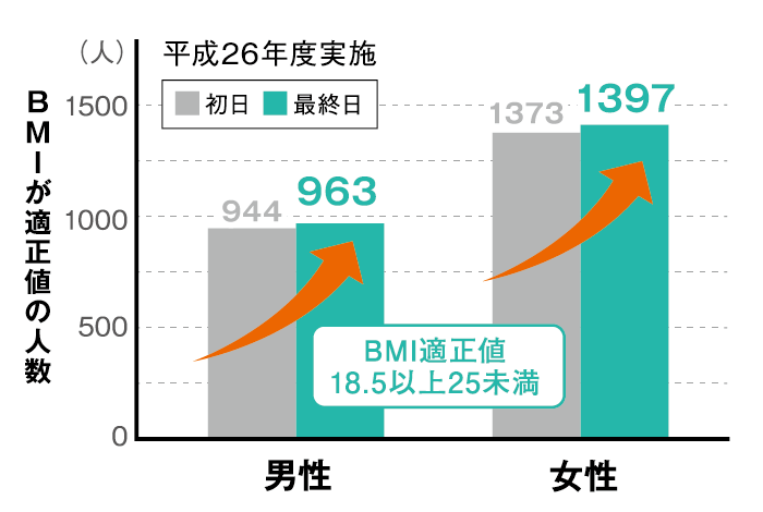 同市のチャレンジ方法は、専用のWEBシステムもしくは書面で申し込み、期間中に体重を記録するだけ。簡単に記録できるようにICTを活用した仕組みを構築しつつ、手書きの記録表も用意した。ただ、それだけでは無関心層には響かないと考え、“参加賞”や“達成賞”として、市の名産品などの賞品も用意したという。さらに、職員自ら企業や老人クラブなど団体訪問も実施。チームで楽しく競い合うことでやる気向上を目指した。「最初はまわりに言われ渋々参加した人も多かったようですが、参加してしまえば体重と向き合うことに楽しさを見出す人も多く、100日チャレンジを完走した参加者は6割を超えました」と小林さん。その結果、男女ともに体格指数(BMI)の適正値の人数が増加した。また、教育委員会・学校とも連携し、小中学生には「朝ごはん100日チャレンジ」を実施。これらの参加者を合わせ、初年度は目標の1万人を突破できたという。