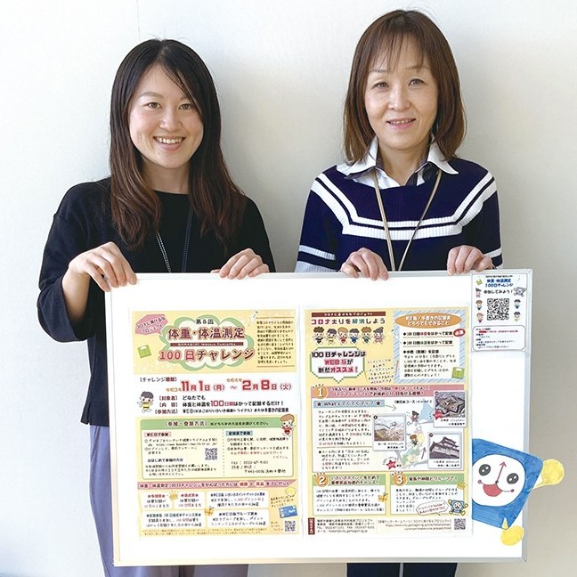 内容を検討する中、1つのグループが、メタボと体重の関係性に着目。まずはグループ内で毎日体重を量り、変化を見る検証を開始した。そこで、体重測定が生活習慣や健康管理の意識向上につながるという結果を得て、この動きを庁内全体へ広げていくことに。「ただ毎日体重を量るだけですが、自然と健康に意識が向くのです。これなら市民へも展開できるということで、平成26年度に『体重測定100日チャレンジ!めざせ1万人!』がスタートしました」。