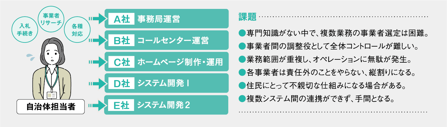 新事業立ち上げとなった場合、担当職員は、各業務に適した事業者をリサーチ。個々の仕様書を作成し、入札などを経て、決定した事業者に個別発注となり、負担が大きい割に全体コストも上がってしまう。