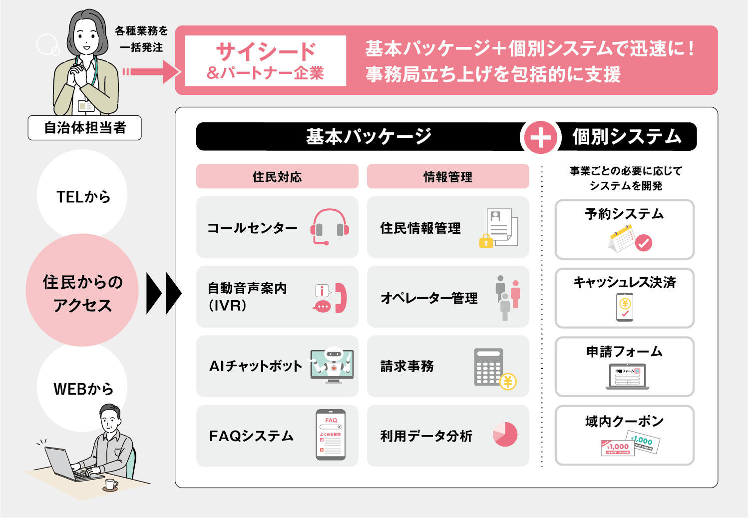 新事業の立ち上げから運営全体を“事務局”に任せる。各種業務の全体最適を考えた上で、システムとオペレーションの要件を定め、迅速に立ち上げ。スタート後も自治体の現場管理の手間を省きつつ、コスト減を図る。