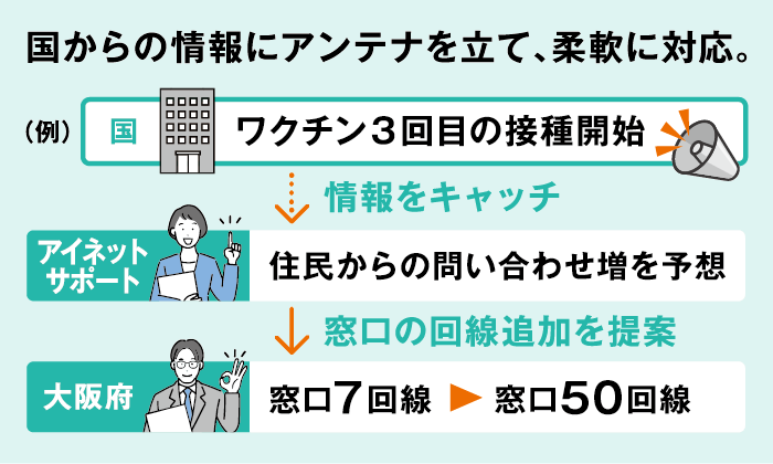 コロナ禍のようなケースでは、国や自治体の方針変更がよく起こるが、豊富な実績で回線数の変更にも柔軟かつスピーディに対応。住民に安心を届けつつ自治体の業務負担軽減を陰でサポートし続ける。
