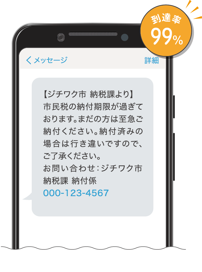 IPではなく電話回線を使うSMSは個人へのリーチ力が高い。その到達率は99%※といわれており、滞納整理などの業務には非常に適している。