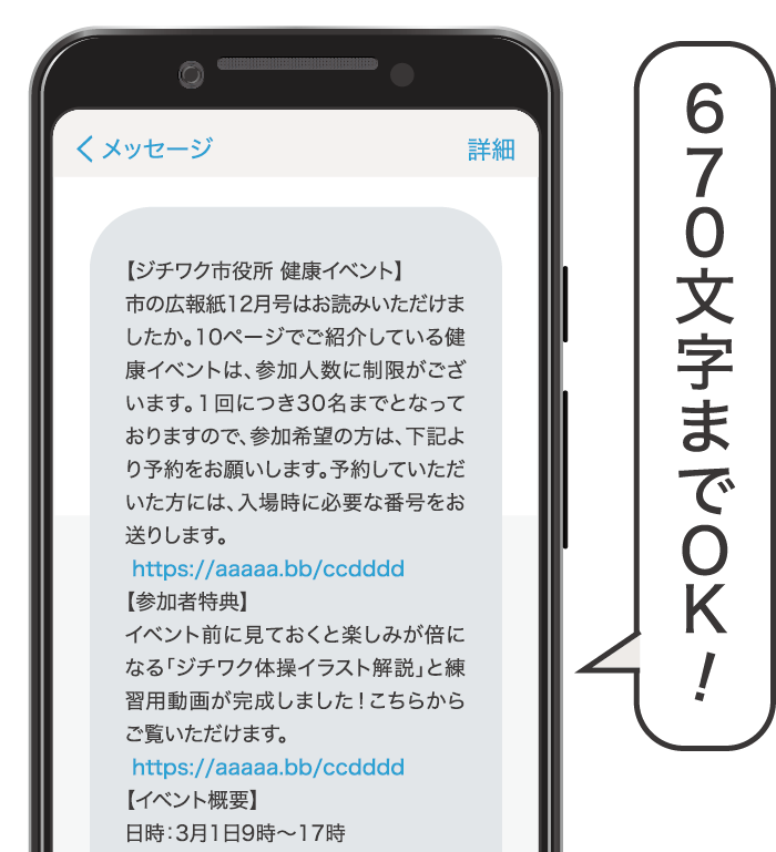 SMSといえば短文のイメージがあるが、ジチタイSMSなら670文字まで送信可能(NTTdocomoのみ660文字)。短縮URL変換機能もついて、簡潔で見やすい文面に!