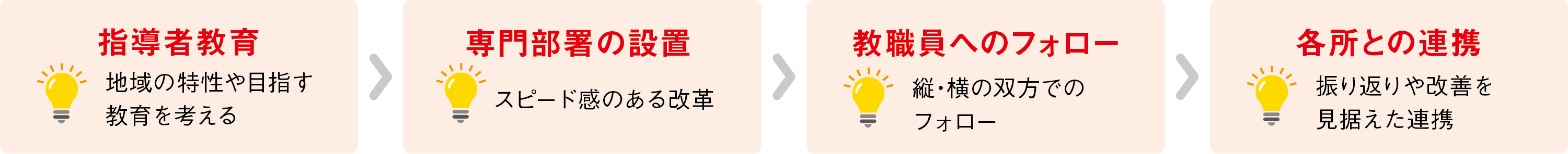 教育委員会などによる教職員へのフォローをはじめ、教員同士の学びの場や外部との情報共有の場を積極的に設け、スムーズな導入を目指す。