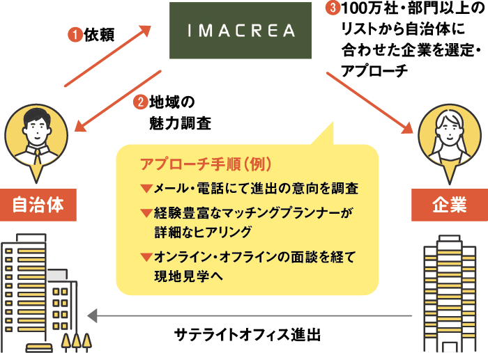 サテライトオフィス誘致のため、進出企業に響く訴求ポイントやニーズ調査を実施。その後、経験豊富なマッチングプランナーと全国各地のスタッフが、メールや電話、会議を組み合わせた戦略的なアプローチを行い、最適なマッチングをサポートする。