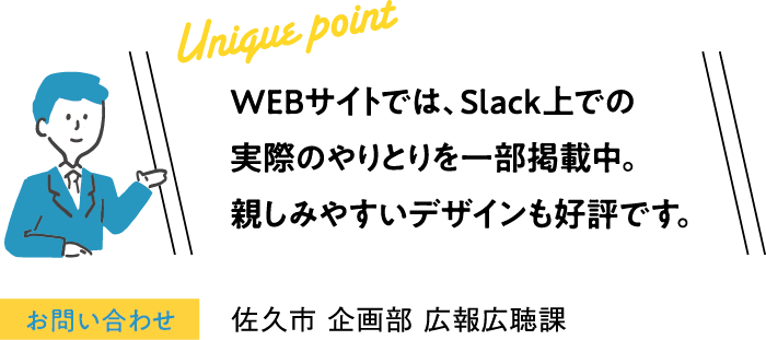 コロナ禍におけるシティプロモーションの一環として、移住希望者が足を運ぶことなく、現地の情報を得られる移住のオンラインサロン「リモート市役所」を開始した佐久市。自治体では初めて、チャットツールの「Slack」を活用し、気軽に情報交換ができる場を構築している。