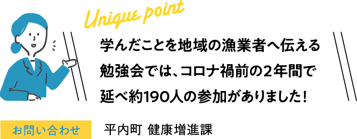 ほたての養殖が盛んな平内町では、平成22年の厚生労働省による「市区町村別生命表」において、平均寿命が男女ともに低かったという。普段から漁業者の健診受診率が低いこともあり、「まちの基幹産業を支える漁業者の健康を守ろう」と、漁協関係者や地域の代表者が手を取り、平成26年「漁師の健康を考える会」(以下、考える会)を設立。健康をテーマにした勉強会などを通し、知識や理解を深めた。その中で出た“健診の時間と出荷時間が重なる”という意見を踏まえ、平成27年から漁協の協力を得て健診日の午前中を休漁日にし、漁業者が受診しやすい体制が実現した。