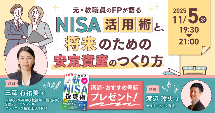 本セミナーでは、元・教職員でファイナンシャルプランナーとして活動する講師がNISAの活用法について、実践を重ねて成果を上げているサラリーマン投資家の講師が不動産投資を活用した資産形成について、わかりやすく解説します。
