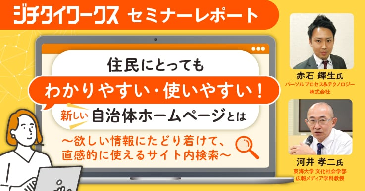 今回のセミナーでは、”住民のニーズに応える形で欲しい情報にたどり着けるHP”とは、どういったものかという観点から、ご自身でもHPの制作などを手掛けられている、パーソルプロセス&テクノロジーの赤石様に、お話しいただきます。また、何が違うからわかりやすいのか、なぜ早く欲しい情報にたどり着くことができるのか、より新しい住民に寄り添った広報の形を東海大学の河井教授に解説いただきながら、ご紹介します。