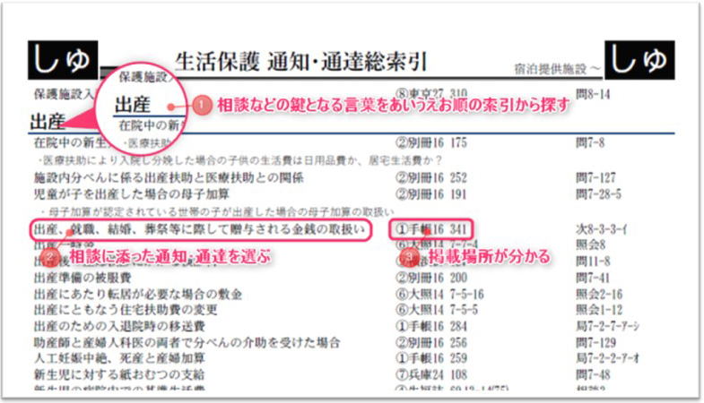 例えば、「出産のお祝いに叔母からお祝い金をもらったけれども、収入申告しなきゃいけないのか?」というような相談があれば、まず「出産」「祝い金」など、思いつくキーワードから、質問に添った通知・通達を探すとすぐに生活保護手帳の何ページに掲載されているかを見つけることができます。