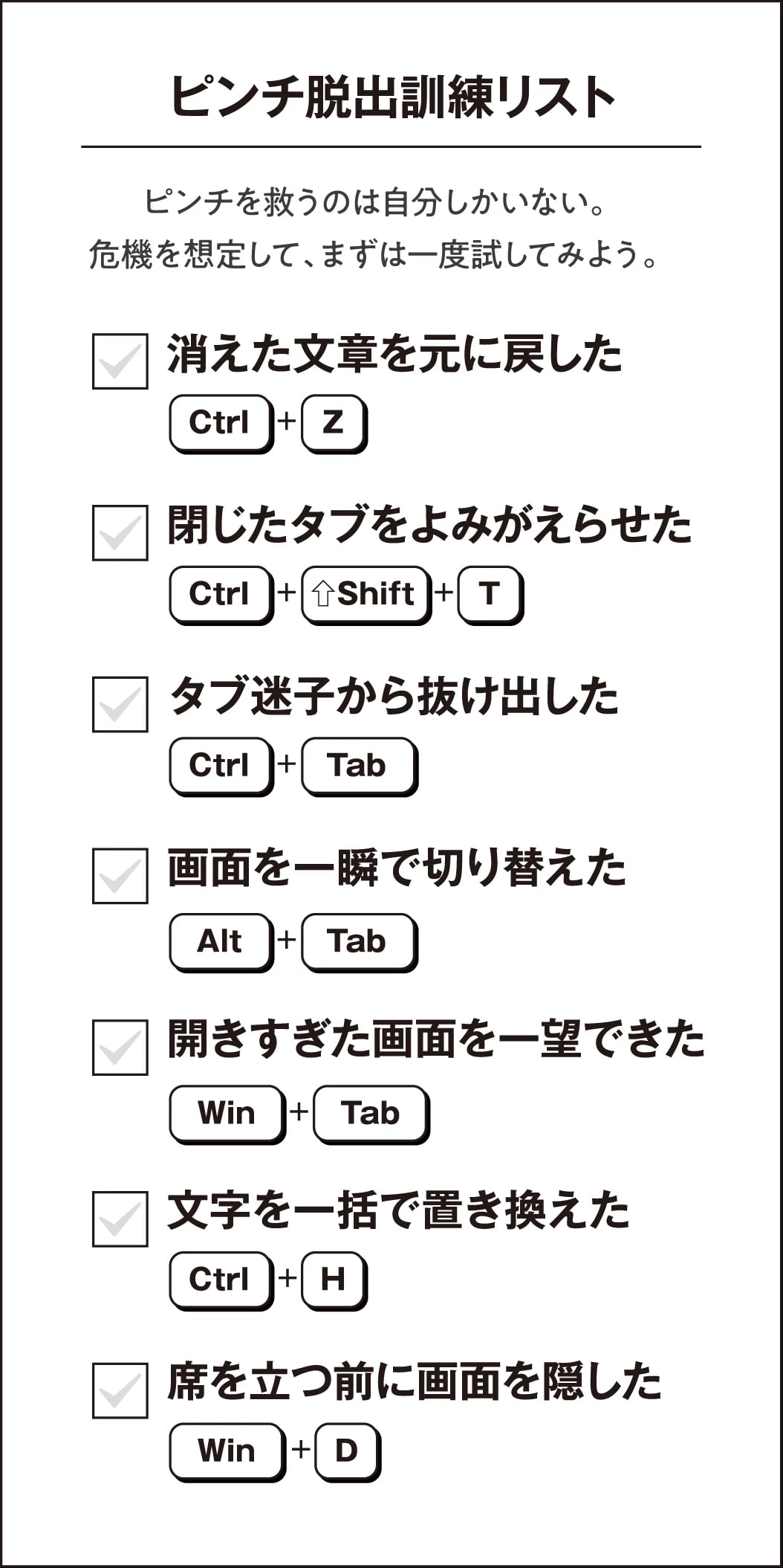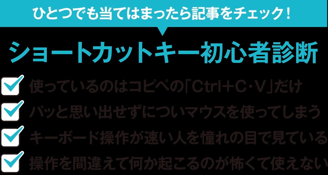パソコン操作の時短術として知られるショートカットキー。いつか覚えたいと思いながら永遠に後まわしにしていないだろうか。「いつか」は待っていてもやってこない。取り組むにあたってのマインドから職場でのピンチを救う一手まで、あなたの「今年こそ!」を後押しする。