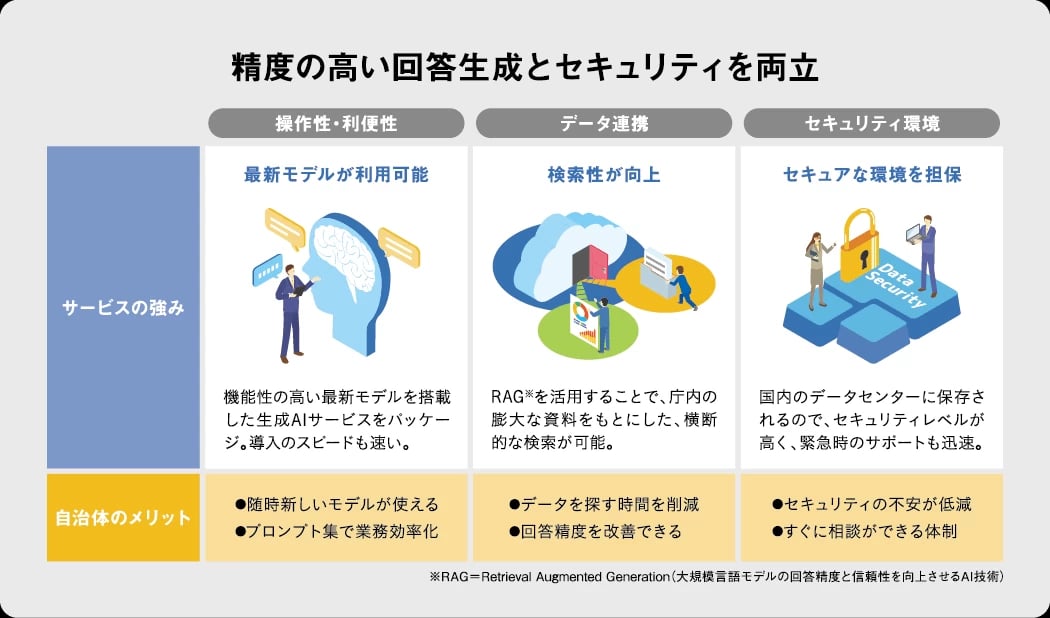 同サービスでは、最新の生成AIモデルや、使い勝手のよいUI、データ連携機能、安心のセキュリティ環境などを包括的に提供している。サポート窓口もあり、独自に環境を構築するより導入コストが抑えられ、実装までのスピードも速い。同社はサービスをすでに導入している他自治体と同県をつないでヒアリングの場を設けるほか、プロジェクト全体の管理や伴走支援を行っている。